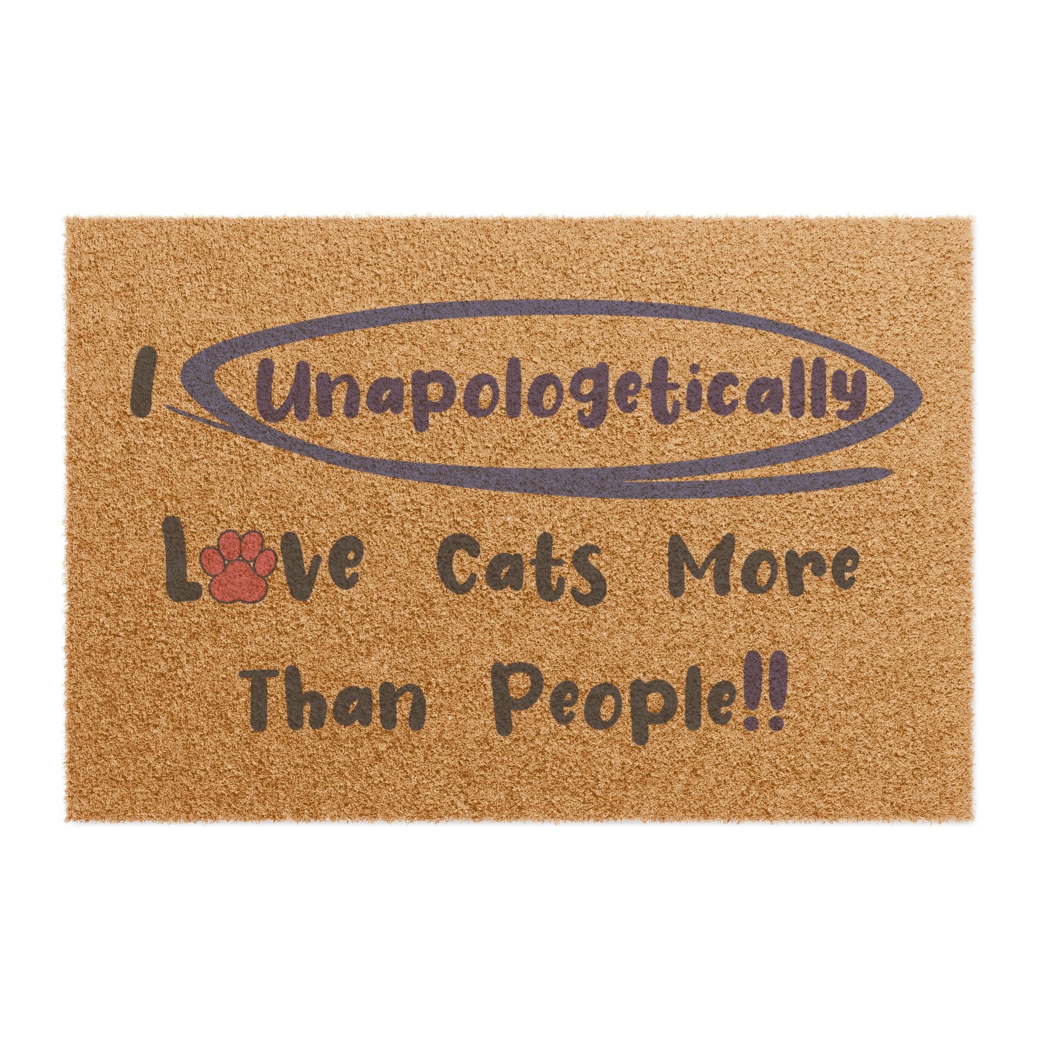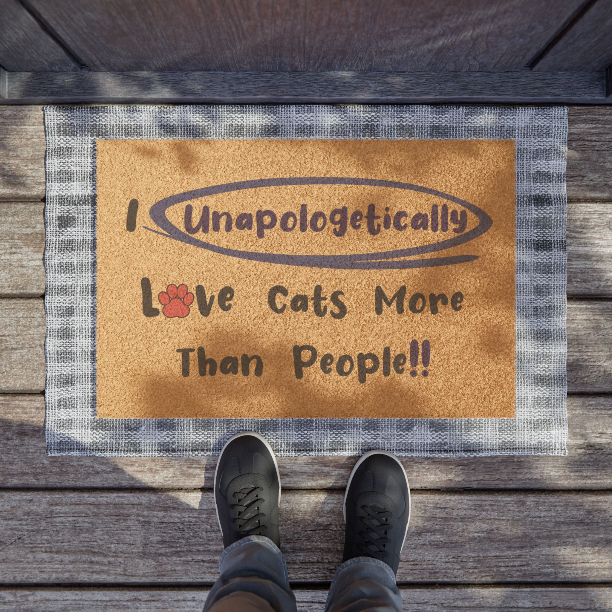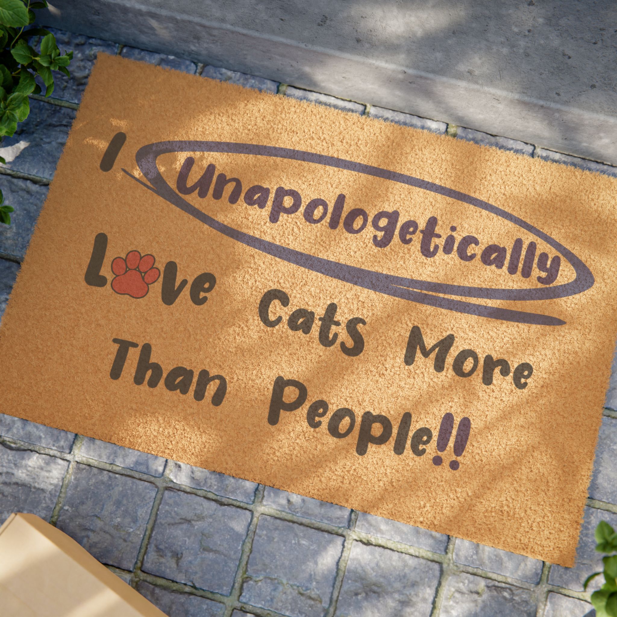 Welcome guests to your home with this charming doormat that proudly expresses your love for cats!   Made from eco-friendly, grade-A tufted coconut fiber, this doormat adds a warm and inviting touch to your entryway while being kind to the planet.  The playful message, “I Unapologetically Love Cats More Than People!!” sets a fun tone, making it a perfect fit for cat lovers and pet enthusiasts.  Ideal for outdoor use, it helps keep your entry clean while showcasing your personality.  Perfect for holidays and celebrations like National Cat Day or housewarmings, this doormat not only enhances your home décor but also brings a smile to every visitor’s face.  It’s a delightful addition for anyone who loves to combine style with a personal statement in their home, making it a unique gift for friends and family who share the same feline affection.