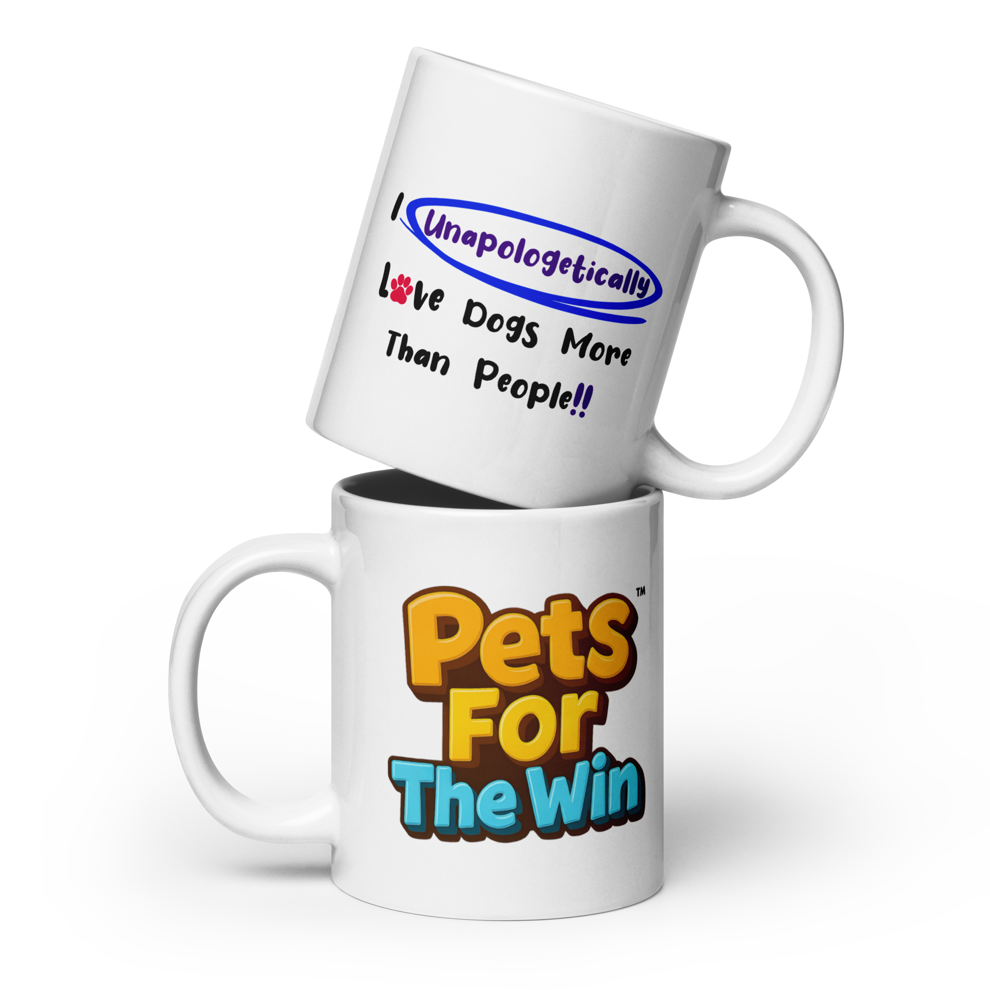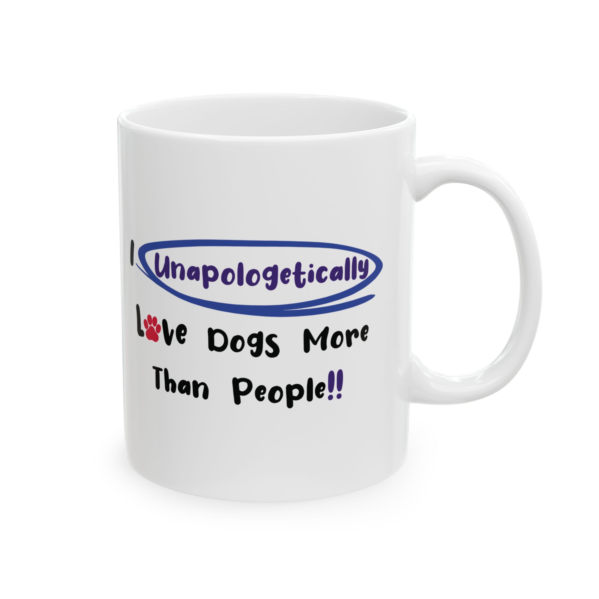 A ceramic mug with a glossy finish and the fun message ‘Unapologetically Love Dogs More Than People’.  Perfect for dog lovers who prioritize their furry friends over everything else.  Great for enjoying a cozy cup of tea or coffee at home or in the office.  Ideal for dog lovers, pet owners, and animal enthusiasts.  Relevant for holidays like National Dog Day or Christmas gifts for dog owners.